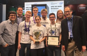 Ein Team von Studierenden des Departments Informatik hat unter der Betreuung des Lehrstuhls INF 3 (Rechnerarchitektur) bei der ISC HIGH PERFORMANCE 2018 im Rahmen der dort ausgetragenen Student Cluster Competition den Preis „Highest Linpack Award“ gewonnen. Diesen konnte ein Team der FAU bereits im letzten Jahr für die FAU gewinnen. Im Bild ist das aktuelle Team zusammen mit dem Hardwaresponsor (HPE) zu sehen.