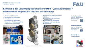 Unsere Zentralwerkstatt (MEW) entwirft und fertigt Bauteile und Geräte für die Forschung. Hauptsächlich werden Aufträge für Mitglieder der Technischen Fakultät ausgeführt, aber auch andere Universitätsmitglieder und Kooperationspartner können die Dienstleistungen in Anspruch nehmen.