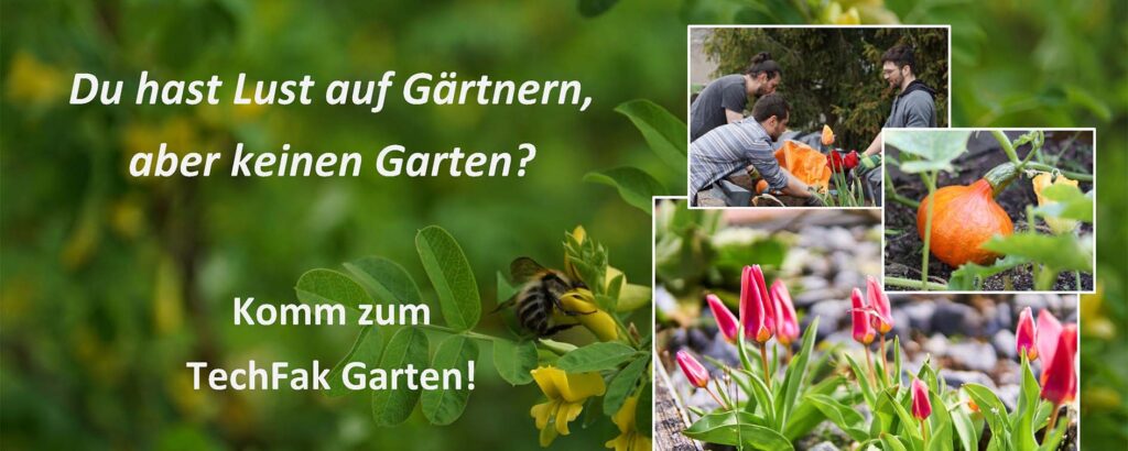 Beim TechFak Garten handelt es sich um ein Urban Gardening Projekt am Roten Platz des FAU Campus Erlangen Süd. So funktioniert es: Studierende bepflanzen und pflegen selbstständig eine ca. 2m² Hochbeetfläche und ernten später hoffentlich Ertrag. Die Gruppe stellt bei Bedarf ein Saatgut-Startpaket. Für die Gartenarbeit kannst du ihre Werkzeuge und sonstiges Material mitnutzen, bei Fragen zum Gärtnern stehen sie ebenfalls gern zur Seite.